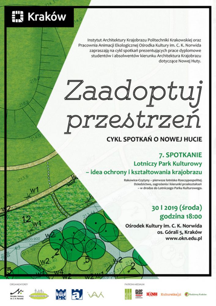 Siódme spotkanie ZAADOPTUJ PRZESTRZEŃ poœwięcone będzie kierunkom ochrony terenów dawnego lotniska Rakowice-Czyżyny, które zostanš zaprezentowane w wykładach zaproszonych goœci oraz w pracach dyplomowych studentów kierunku Architektura Krajobrazu Wydziału Architektury Politechniki Krakowskiej.