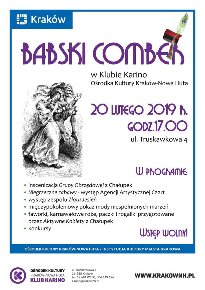 Klub Karino Oœrodka Kultury Kraków-Nowa Huta (ul. Truskawkowa 4) zaprasza kobiety do udziału w krakowskiej zabawie odpustowej, której tradycja sięga œredniowiecza. Po raz czwarty panie skupione w Grupie Aktywnych Kobiet i Grupie Obrzędowej „Chałupki” zorganizujš „babski comber”. Inscenizacja dawnych zwyczajów, pokaz międzypokoleniowej mody, występ zespołu Złota Jesień, „Niegrzeczne zabawy” w wykonaniu Agencji Artystycznej Caart oraz karnawałowe przysmaki – pšczki, faworki, róże i rogaliki – to atrakcje, które czekajš na uczestniczki imprezy. Uwaga, panowie! W tym dniu do Klubu Karino zbliżacie się na własnš odpowiedzialnoœć!