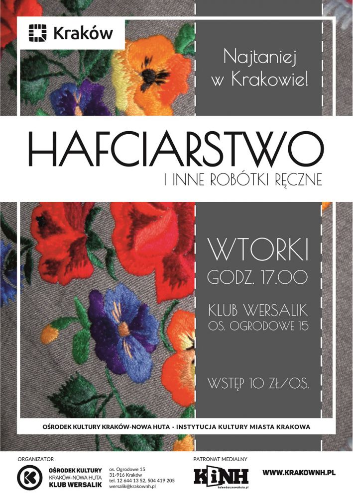 Hafciarstwo czy szydełkowanie to ulubione zajęcia naszych prababć – zajęcia, które miały już odejœć do lamusa zastšpione przez rozrywki ery cyfrowej, tymczasem za sprawš wyobraŸni kolejnych pokoleń zyskujš nowe życie. Klub Wersalik Oœrodka Kultury Kraków-Nowa Huta (os. Ogrodowe 15) zaprasza na warsztaty haftu ręcznego oraz innych robótek ręcznych. Nasze warsztaty to okazja do wymiany doœwiadczeń i inspiracji dla tych, którzy na przegryzaniu nici dawno zjedli zęby. Dla poczštkujšcych i osób, które dopiero pragnš poznać warsztat hafciarski, szydełkowanie czy robótki na drutach - szansa na poznanie prawdziwych pasjonatów rękodzieła, zdobycie wiedzy i doœwiadczenia, a przede wszystkim życzliwego wsparcia bardziej doœwiadczonych hobbystów.