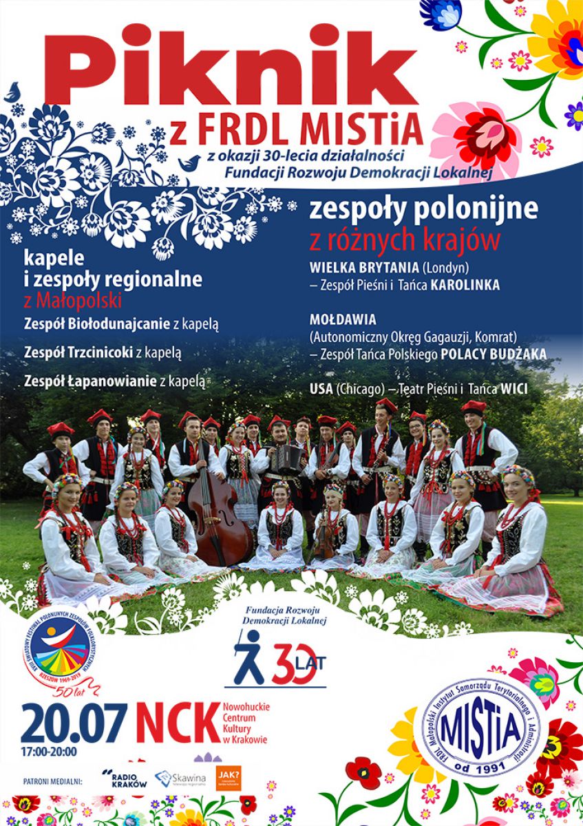 20 lipca 2019, w Nowohuckim Centrum Kultury z okazji obchodów 30-lecia działalnoœci Fundacji Rozwoju Demokracji odbędzie się plenerowy koncert jubileuszowy zespołów polonijnych