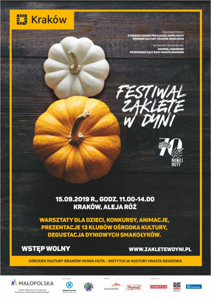 Nowohucka pomarańczowa alternatywa zwyczajnej niedzieli to VIII edycja Festiwalu Zaklęte w Dyni, który odbędzie się 15 wrzeœnia w godzinach 11.00-14.00. Tego dnia warto wybrać się na Aleję Róż, by podziwiać dyniowe rzeŸby i najpiękniejsze okazy warzyw uprawianych na obrzeżach Krakowa, skosztować dyniowych potraw, wzišć udział warsztatach i zabawach, przygotowanych przez kluby Oœrodka Kultury Kraków-Nowa Huta oraz otrzymać bezpłatnš ksišżkę i mapę przygód nowego nowohuckiego bohatera – Pana Dyni.