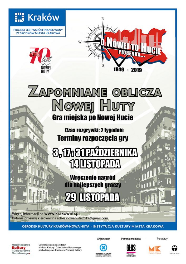 Oœrodek Kultury Kraków-Nowa Huta zaprasza wszystkich poszukiwaczy przygód, lubišcych łšczyć przyjemne z pożytecznym, do podjęcia wyzwania 2-tygodniowej rozgrywki o historii Nowej Huty. Udział w grze pozwoli sprawdzić umiejętnoœci takie jak pomysłowoœć, bystroœć umysłu i zdolnoœci manualne, a ponadto poznać historię największej i najbardziej zróżnicowanej kulturowo dzielnicy Krakowa. Gra „Zapomniane oblicza Nowej Huty” odbywa się w ramach projektu „O Nowej to Hucie piosenka… - 70 lat sztuki i historii”, dofinansowanego ze œrodków Ministra Kultury i Dziedzictwa Narodowego, pochodzšcych z Funduszu Promocji Kultury. Do rozgrywki można dołšczyć 3, 17 i 31 paŸdziernika oraz 14 listopada w Klubie Jędruœ Oœrodka Kultury Kraków-Nowa Huta (os. Centrum A 6a).