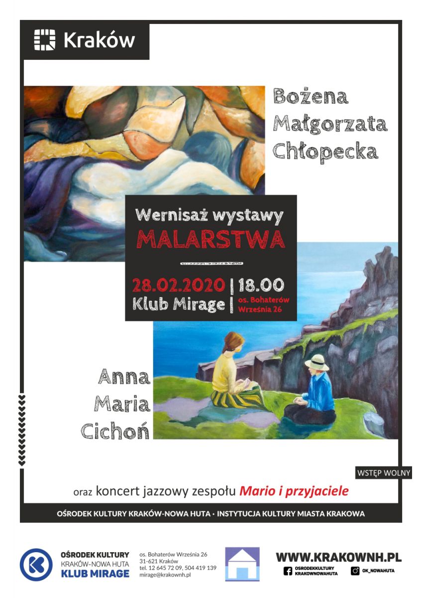 Klubie Mirage Orodka Kultury Kraków-Nowa Huta zaprasza na wystawę malarstwa Bożeny Małgorzaty Chłopeckiej i Anny Marii Cichoń. Wernisaż wystawy odbędzie się w 28 lutego (pištek) o godz. 18.00. w Galerii M Plus Klubu Mirage. Wydarzenie uwietni koncert jazzowy w wykonaniu zespołu Mario i przyjaciele.