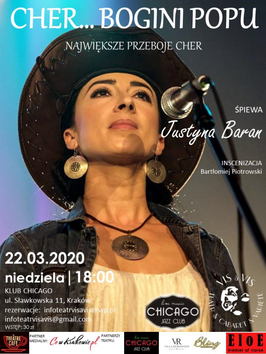 Podczas koncertu największe przeboje CHER BOGINI POPU zapiewa dla Państwa artystka Teatru VIS A VIS aktorka i wokalistka obdarzona niezwykłym głosem oraz ogromnym temperamentem scenicznym JUSTYNA BARAN.