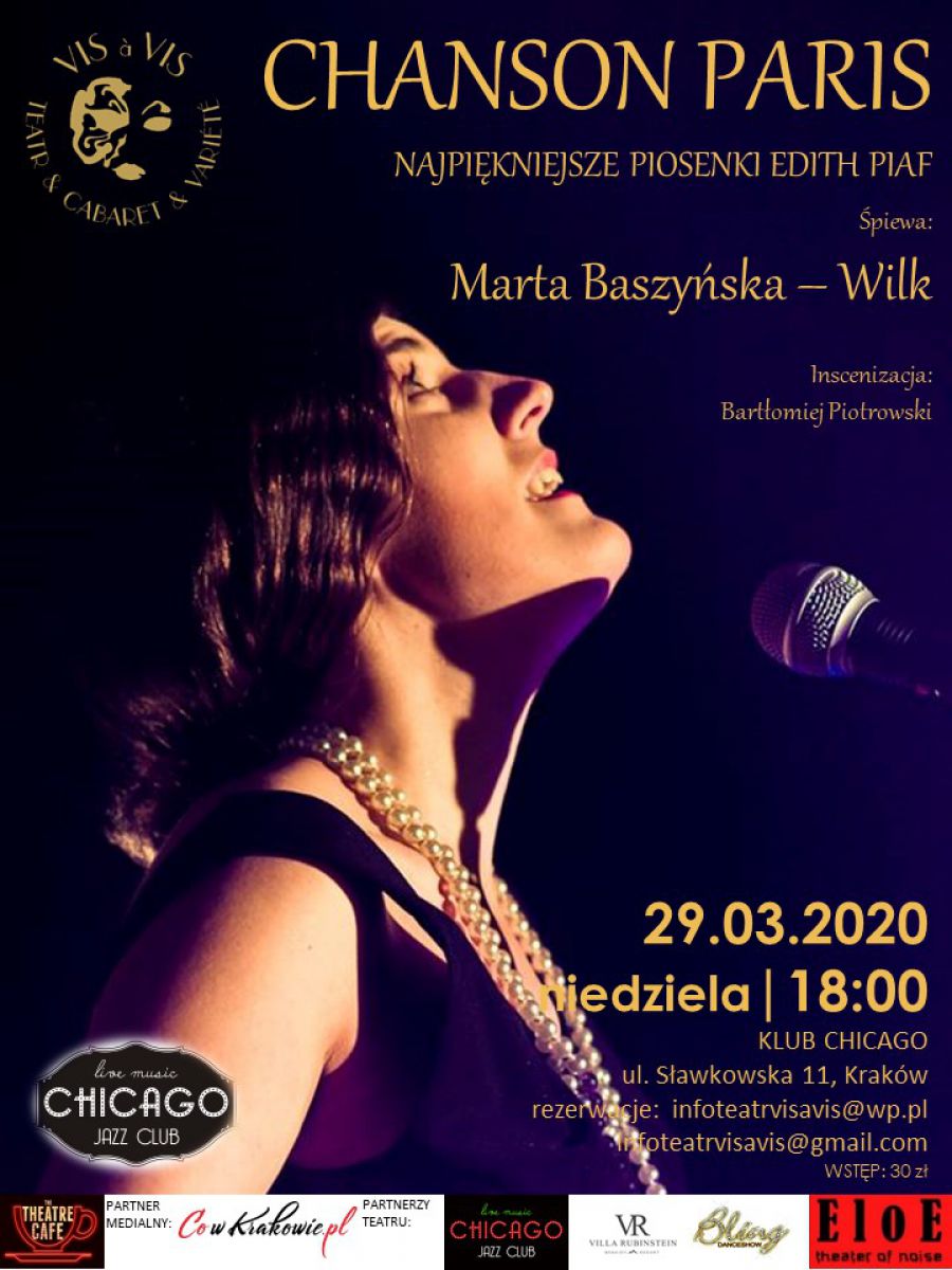 W wyjštkowym programie CHANSON PARIS - najpiękniejsze piosenki Edith Piaf, francuskie szlagiery oraz przeboje Ewy Demarczyk, a także wiersze Jacquesa Preverta i Haliny Powiatowskiej - zapiewa dla Państwa Marta Baszyńska - Wilk aktorka scen muzycznych i wokalistka.