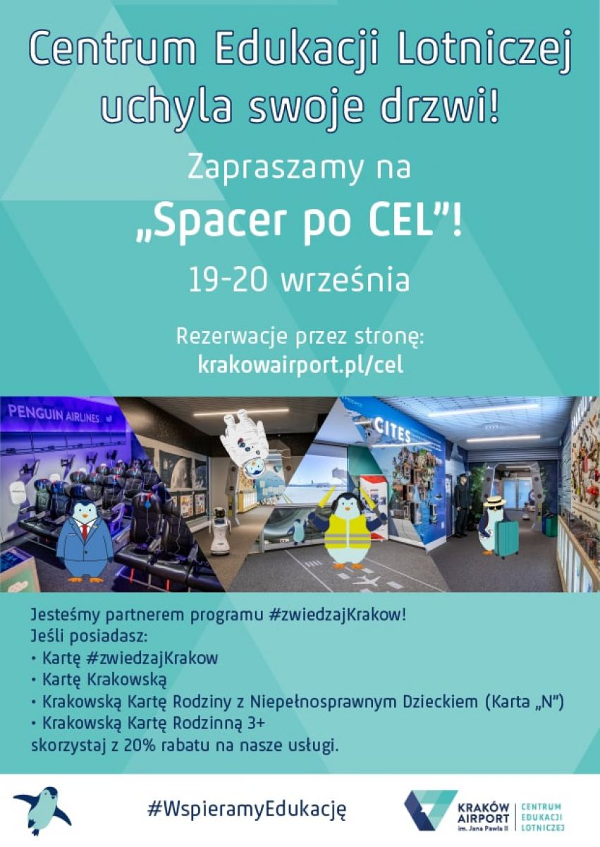 W weekend, 19-20 wrzeœnia, Centrum Edukacji Lotniczej w Balicach zaprasza na „Spacer po CEL”, czyli ekscytujšcš wycieczkę po jedynym w Polsce oœrodku popularyzujšcym wiedzę z zakresu lotnictwa cywilnego. Będzie można zwiedzić sale zaaranżowane na terminal pasażerski i wnętrze samolotu, wcielić się w rolę pasażera lub stewardessy, a nawet, dzięki rzeczywistoœci wirtualnej, zaparkować samolot na płycie lotniska.