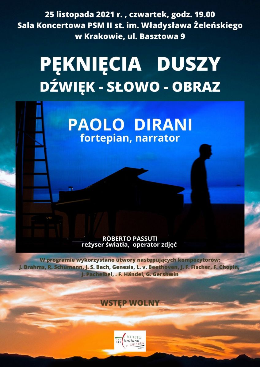 Włoski Instytut Kultury w Krakowie zaprasza w czwartek 25 listopada 2021 r. o godz. 19.00 do Sali Koncertowej Państwowej Szkoły Muzycznej II stopnia im. W. Żeleńskiego w Krakowie przy ul. Basztowej 9 na projekt muzyczny „Pęknięcia duszy” Paolo Diraniego, który wystąpi w podwójnej roli pianisty i narratora.
