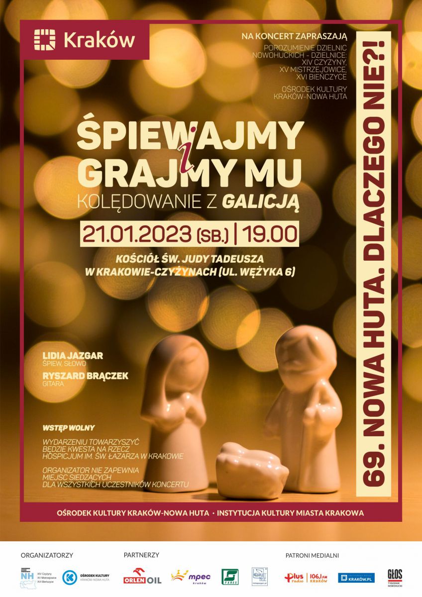 „W historii cyklu koncertów „Nowa Huta. Dlaczego nie?!”, tak jak i w polskiej tradycji, grudzień i styczeń to czas kolędowania. Tak będzie i teraz. Chcemy przedłużyć radość Świąt Bożego Narodzenia, po krakowsku za sprawą duetu Galicja, który wykona swoje świąteczne piosenki pełne ciepła i radości. Kameralne brzmienie sprzyjać będzie słuchaniu siebie nawzajem i refleksji”– mówi Lidia Jazgar, kierownik artystyczny cyklu.