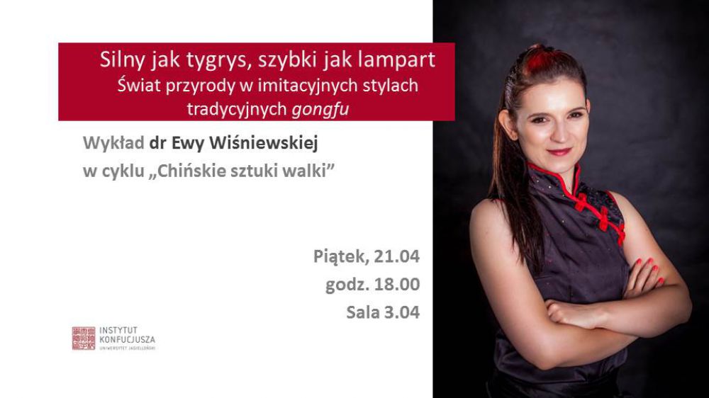 Instytut Konfucjusza w Krakowie serdecznie zaprasza na wykład dr Ewy Wiśniewskiej w cyklu „Chińskie sztuki walki”, pt. Silny jak tygrys, szybki jak lampart - świat przyrody w imitacyjnych stylach tradycyjnych gongfu”.