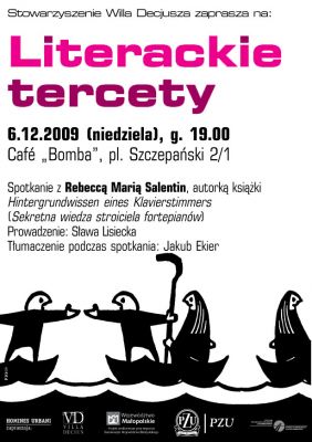 Stowarzyszenie Willa Decjusza w ramach programu Literackie tercety zaprasza w niedzielę, 6 grudnia, o godzinie 19.00 do Café Bomba (Kraków, pl. Szczepański 2/1) na spotkanie z Rebeccš Mariš Salentin, autorkš ksišżki Hintergrundwissen eines Klavierstimmers (Sekretna wiedza stroiciela fortepianów). Spotkanie poprowadzš Sława Lisiecka i Jakub Ekier (tłumaczenie).