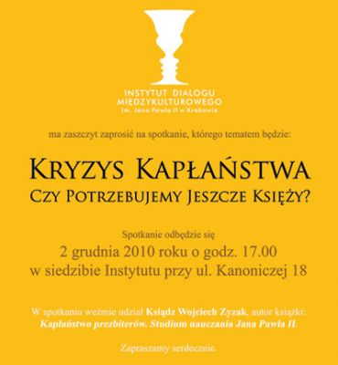 Odbędzie się ono 2 grudnia 2010 o godzinie 17:00, w siedzibie Instytutu przy ulicy Kanoniczej 18. Temat naszej dyskusji nawišzuje do ksišżki: Kapłaństwo prezbiterów. Studium nauczania Jana Pawła II. W spotkaniu weŸmie udział Ksišdz Wojciech Zyzak, autor ksišżki. W swej monografii ksišdz Zyzak omówił szeroko takie tematy jak: tożsamoœć prezbitera, Bóg jako Ÿródło kapłaństwa, miejsce i rola prezbitera we wspólnocie Koœcioła, misja kapłana, jego duchowoœć i formacja. Można powiedzieć, że jest to jak dotšd najbardziej Ÿródłowe, obszerne i wyczerpujšce studium tematu kapłaństwa w nauczaniu Ojca Œwiętego. Ksišżka ta stanowi jednoczeœnie przystępny i wieloaspektowy podręcznik duchowoœci kapłańskiej, który winien znaleŸć się przede wszystkim w bibliotece każdego prezbitera.