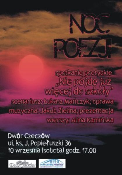 Zapraszamy na "Noc poezji", w ramach której odbędzie się spotkanie poetyckie „Nie pójdę już więcej do szkoły” – wiersze o szkole poczšwszy od klasyków, a skończywszy na cytowanym w tytule singlu Republiki oraz utworach Pink Floyd z „The Wall”.