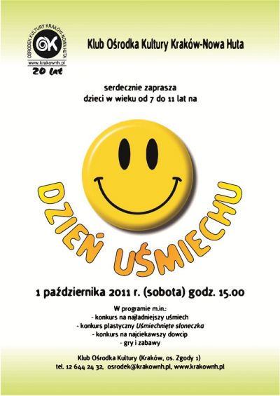 Klub Oœrodka Kultury Kraków- Nowa Huta (os. Zgody 1) zaprasza dzieci w wieku od 6 do 11 lat z pobliskich osiedli do wspólnej zabawy z okazji Międzynarodowego Dnia Uœmiechu.