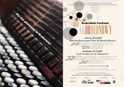 26 i 27 listopada 2011 odbędzie się pierwszy w Krakowie Festiwal Akordeonowy, w zamierzeniu coroczny, którego organizatorem jest Fundacja Art Forum w tym roku przy współpracy Stowarzyszenia Instytut Sztuki oraz Lochu Camelot. W cišgu dwóch dni, trwania tego wydarzenia, usłyszymy szereg instrumentalistów i zespołów wykonujšcych różne style i gatunki muzyczne, jednak zawsze połšczone wspólnym mianownikiem jakim jest akordeon. W programie festiwalu znajdzie się m.in.: jazz, piosenka poetycka, muzyka cygańska i francuska, argentyńskie tango oraz muzyka klasyczna jak i współczesna. Na scenie zaprezentujš się znane postacie wiata muzycznego, takie jak: Joanna Słowińska i Jarosław Bester, Basia Stępniak-Wilk, Jaga Wrońska oraz wschodzšce gwiazdy i młode talenty polskiej muzyki: Armonia Lyrica (w składzie: Bożena Boba-Dyga - piew, trio akordeonowe Sirius trio: Grzegorz Palus, Grzegorz Miszczyszyn, Maciej Zimka), Django Tango Project (w składzie: Konrad Ligas - akordeon, Jacek Serczyk - gitara, Michał Rapka - kontrabas), Duo Acco-sfera (w składzie: Alena Budzinakova, Grzegorz Palus), Grzegorz Miszczyszyn, Sound Quality Quartet (w składzie: Maciej Kwarciński - flet, Jacek Kopiec akordeon, Mateusz Frankiewicz kontrabas, Michał Pamuła perkusja), Maciej Zimka i gocinnie Miłosz Mšczyński. Festiwal będzie się odbywał w Klubie Pod Jaszczurami i Teatrze 38 oraz w Lochu Camelot. Bilety na poszczególne koncerty i karnety festiwalowe do nabycia w Klubie Pod Jaszczurami od dnia 18.11.2011 oraz w Lochu Camelot przed koncertami.