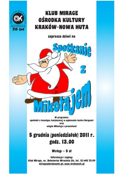 Mikołajkowa impreza dla dzieci w Klubie Mirage Oœrodka Kultury Kraków-Nowa Huta, podczas której najmłodsi wezmš udział w przedstawieniu Gdzie jest Mikołaj w wykonaniu aktorów teatru Horyznot. Spotkanie uœwietni wizyta Mikołaja, który rozda wszystkim grzecznym dzieciom prezenty.Zainteresowanych rodziców prosimy o wczeœniejsze zgłoszenia i przyniesienie paczki dzień przed imprezš do klubu. Liczba miejsc ograniczona.