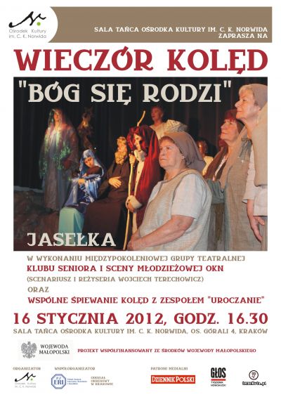 Bóg się rodzi jasełka, powstały w wyniku dwumiesięcznej pracy istniejšcych przy naszej instytucji grup z Klubu Seniora oraz Sceny Młodzieżowej, w ramach projektu Między pokoleniami. W tym czasie odbywały się warsztaty teatralno muzyczne, które prowadził Wojciech Terechowicz, aktor, reżyser, nauczyciel retoryki, który był także reżyserem całoci przedsięwzięcia. Międzypokoleniowy projekt okazał się sukcesem a widowisko przyjęto z ogromnym aplauzem premiera odbyła się 19 grudnia 2011 roku. Teraz możecie Państwo osobicie zobaczyć to ciekawe wydarzenie w Sali Tańca OKN podczas Wieczoru kolęd. Projekt współfinansowany był ze rodków Wojewody Małopolskiego a współorganizatorem spotkania jest Oddział Okręgowy Polskiego Zwišzku Emerytów, Rencistów i Inwalidów w Krakowie. Serdecznie zapraszamy - wstęp wolny.