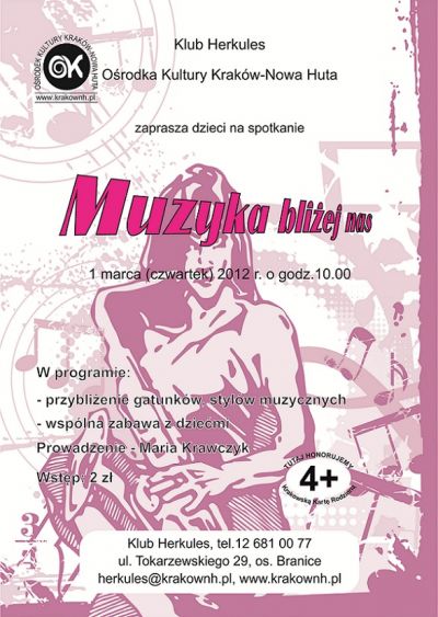 Klub Herkules Orodka Kultury Krakw-Nowa Huta (ul. Tokarzewskiego 29) zaprasza 1 marca (czwartek) 2012 r. o godz. 10.00 na kolejne spotkanie muzyczne prowadzone w formie zabawy, majce na celu przyblienie dzieciom gatunkw i stylw muzycznych, jak rwnie technik kompozytorskich.