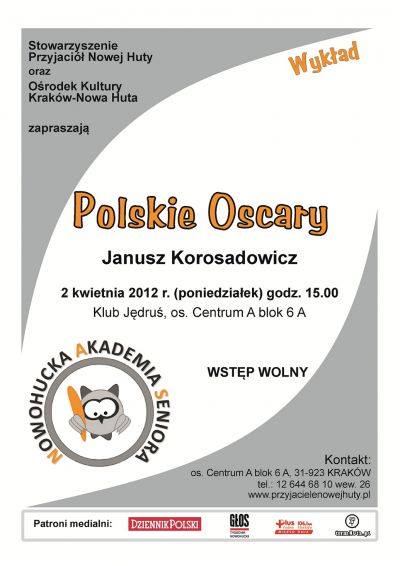 Stowarzyszenie Przyjaciół Nowej Huty oraz Oœrodek Kultury Kraków-Nowa Huta zapraszajš na kolejnš prelekcję w ramach Nowohuckiej Akademii Seniora.