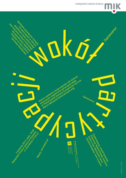 Goćmi pierwszego spotkania będš dr Paweł Kubicki (Instytut Europeistyki UJ) oraz Marcin Wilkowski (historiaimedia.org). Wspólnie przyjrzymy się rosnšcej roli partycypacji w różnych dziedzinach życia społecznego, szczególnie w kontekcie miejskich ruchów obywatelskich, oraz znaczeniu nowych technologii dla popularyzacji oddolnych inicjatyw służšcych ochronie i promocji dziedzictwa.
