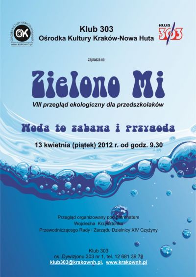 Klub 303 Oœrodka Kultury Kraków-Nowa Huta zaprasza na VIII Przeglšd o tematyce ekologicznej dla przedszkolaków pod hasłem Woda to zabawa i przygoda. Obejrzeć będzie można występy dzieci z przedszkoli działajšcych na terenie Dzielnicy XIV Czyżyny. Przeglšdowi prezentacji scenicznych towarzyszyć będzie wystawa prac plastycznych, w zwišzku z czym, na imprezę zapraszamy również autorów tych prac. Impreza realizowana jest pod patronatem Wojciecha Krzysztonka – Przewodniczšcego Dzielnicy XIV Czyżyny.