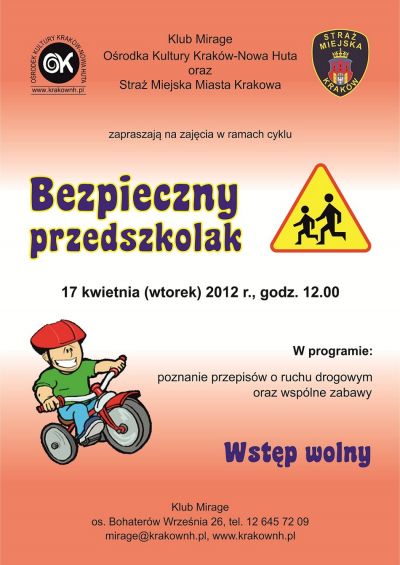 Klub Mirage Orodka Kultury Kraków-Nowa Huta (os. Bohaterów Wrzenia 26) zaprasza na kolejne spotkanie dla dzieci prowadzona przez funkcjonariusza Straży Miejskiej z zakresu bezpieczeństwa i unikania zagrożeń.