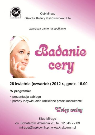 Zapraszamy do Klubu Mirage Orodka Kultury Krakw-Nowa Huta na spotkanie z konsultantkami kosmetycznymi dla pa. W programie: indywidualne porady kosmetyczne, prezentacja zabiegw na twarz oraz kiermasz kosmetykw.