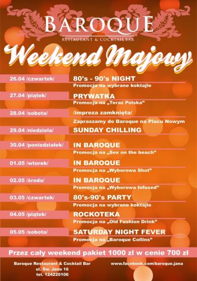 W dniach 26 kwiecień 5 maj krakowski Baroque Restaurant & Cocktail Bar zaprasza na niepowtarzalny i najdłuższy weekend w roku Weekend Majowy! W tych dniach przy ulicy więtego Jana każdy znajdzie dla siebie co ciekawego, a oprócz imprez przewidziano wiele promocji!