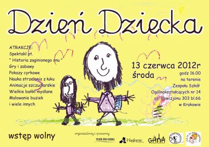 umiejętnoœciami z innymi, postanowiliœmy zorganizować Dzień Dziecka dla najmłodszych, którzy spędzajš czas na nowohuckich podwórkach. Pochodzimy z różnych grup artystycznych min. Teatr Za Jeden Uœmiech, Teatr Inna Bajka, Grupa Happenerska Nowa Huta, Kuglarze (http://www.kuglarze.com.pl ), Krzysztof Skompiński - wojownik mongolski oraz Małopolska Zgraja Sarmacka.