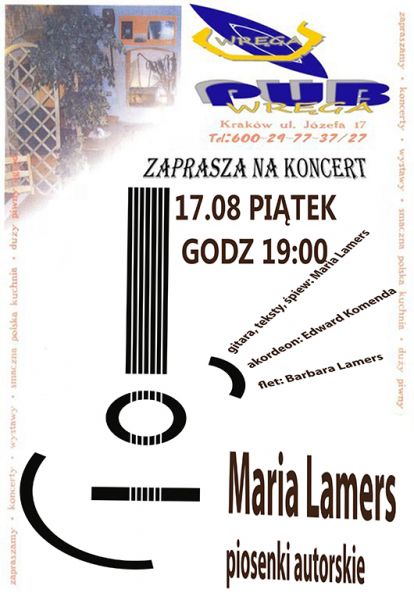W pitkowy wieczr Pub WRGA zaprasza na godzin 19:00 do letniego ogrdka na koncert Piosenki Autorskiej w wykonaniu Mari Lamers