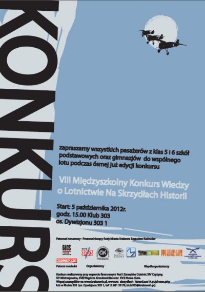 To już VIII edycja międzyszkolnego konkursu wiedzy o lotnictwie Na Skrzydłach Historii. W tym roku organizatorzy: Klub 303 Oœrodka Kultury Kraków-Nowa Huta, Dzielnica XIV Czyżyny oraz Muzeum Lotnictwa Polskiego w Krakowie, do udziału oprócz gimnazjalistów zapraszajš uczniów V i VI klas szkoły podstawowej. Konkurs dla szkół podstawowych odbędzie się pod tematem przewodnim Dlaczego samolot lata?, a dla szkół gimnazjalnych Bitwa o Anglię.