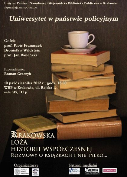 Instytut Pamięci Narodowej oraz Wojewódzka Biblioteka Publiczna w Krakowie zapraszajš na spotkanie Uniwersytet w państwie policyjnym. W dyskusji na temat ksišżki prof. Piotra Franaszka Jagiellończyk. Działania Służby Bezpieczeństwa wobec Uniwersytetu Jagiellońskiego w latach 80-tych XX wieku wezmš udział autor, Bronisław Wildstein oraz prof. Jan Woleński. Spotkanie prowadzi Roman Graczyk.