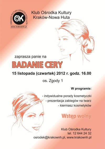 Klub Oœrodka Kultury Kraków-Nowa Huta (os. Zgody 1) zaprasza 15 listopada 2012 r. o godz. 16.00 na spotkanie z konsultantkš kosmetycznš.