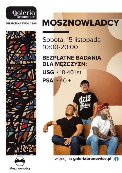W sobotę, 15 listopada, w godz. 10:00–20:00 panowie powyżej 18. roku życia będą mogli wziąć udział w bezpłatnych badaniach w ramach ogólnopolskiej kampanii Mosznowładcy, prowadzonej pod hasłem „Robimy to dla jaj!”. Wydarzenie odbędzie się na parterze Galerii Bronowice, gdzie stanie podwójny mobilny gabinet USG oraz stanowisko do badań poziomu PSA. Udział nie wymaga zapisów ani przygotowania.