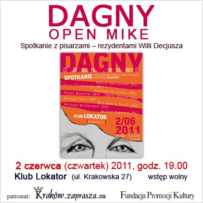 Zapraszamy na kolejny wieczór literacki z cyklu DAGNY – OPEN MIKE, który poświęcony będzie prezentacji twórczości pisarzy – aktualnych rezydentów Willi Decjusza w ramach programu Dagny.