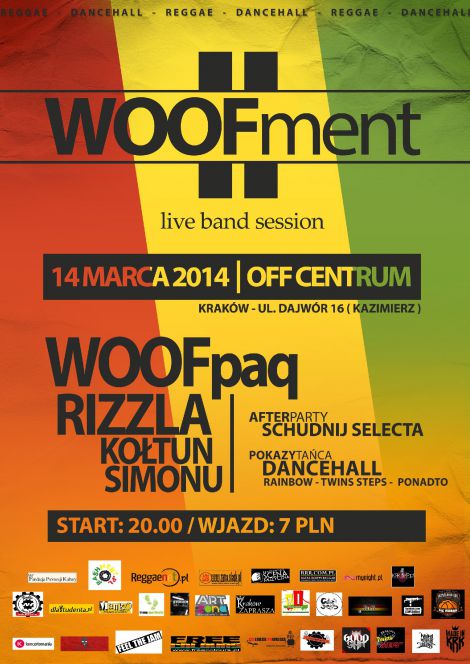 14 marca w klubie OFF CeNtrum odbędzie się druga impreza z cyklu WOOFment - tym razem z żywymi bandami w klimatach reggae i dancehall. Obok gospodarzy, czyli ekipy WOOFpaq, wystąpią zespoły RIZZLA i KOŁTUN, a także wokalista SIMONU, który również poprowadzi imprezę. Afterparty zagra SCHUDNIJ SELECTA z Wrocławia, a całość wzbogacą występy ekip tanecznych: RAINBOW, PONADTO i TWINS STEPS.