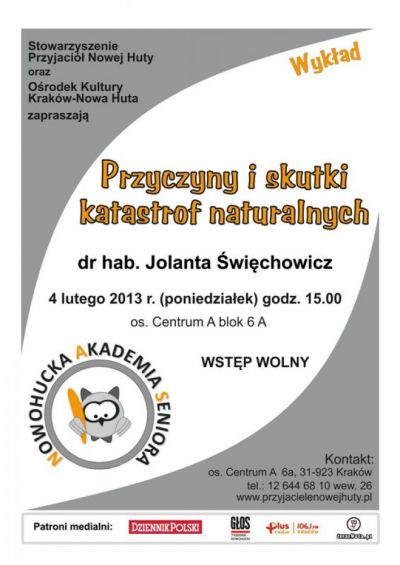Kolejny wykład w Nowohuckiej Akademii Seniora wygłosi dr hab. Jolanta Święchowicz. Przybliży ona słuchaczom przyczyny powstawania zdarzeń katastrofalnych, główne cechy katastrof naturalnych i ich skutki oraz wpływ na życie ludzi.