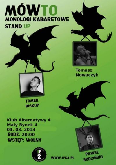 Tradycyjnie zapraszamy na STAND UP i MONOLOGI KABARETOWE w wyknaniu trzech komików, a imprezę kończymy Waszymi występami w ramach OPEN MIKE'A - każdy z Was, kto ma ochotę przedstawić swój fragment stand up'u, dostanie swoje 5 minut na scenie!