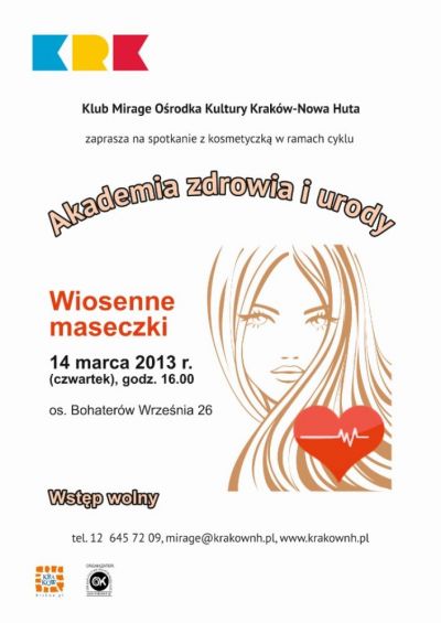 Zapraszamy panie na spotkanie z konsultantkami kosmetycznymi pod hasłem Wiosenne Maseczki, które odbędzie się 14 marca br. o godz. 16.00 w Klubie Mirage Ośrodka Kultury Kraków-Nowa Huta (os. Bohaterów Września 26).