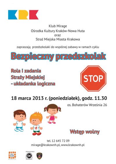 Klub Mirage Ośrodka Kultury Kraków-Nowa Huta (os. Bohaterów Września 26) zaprasza na kolejne z cyklu spotkanie dla przedszkolaków z zakresu bezpieczeństwa. Najbliższe zajęcia odbędą się 18 marca br, o godz. 11.30 pod hasłem Rola i zadania Straży Miejskiej – układanka logiczna.