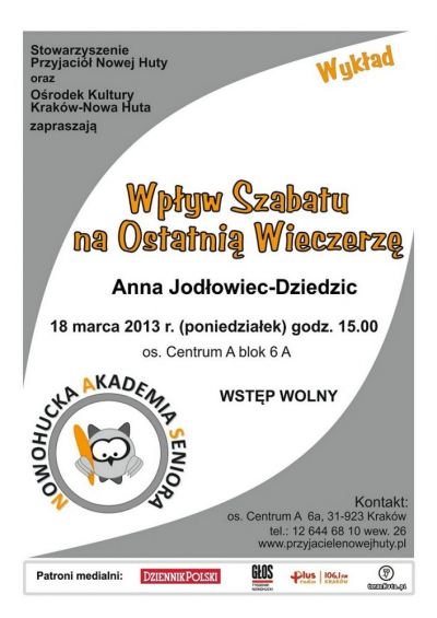 W jaki sposób judaistyczne święto żydowskie, ustanowione na cześć siódmego dnia tygodnia, w którym to wedle Starego Testamentu Bóg odpoczywał po stworzeniu świata, wpłynęło na Ostatnią Wieczerzę? Jak wygląda Szabat, a jak świętuje się Pesach? Na te pytania, jak i na inne dotyczące powiązań i różnic między religią żydowską a chrześcijaństwem, odpowie podczas kolejnego wykładu w Nowohuckiej Akademii Seniora Anna Jodłowiec-Dziedzic.