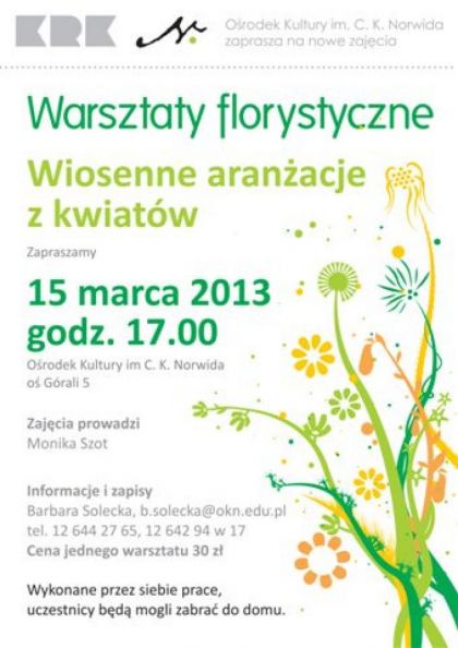 Zapraszamy na warsztaty florystyczne do Ośrodka Kultury im. C. K. Norwida. Warsztaty pozwolą zdobyć umiejętności tworzenia różnorodnych kompozycji z kwiatów, dekorowania stołu i pomieszczeń. Zapoznają uczestników z zasadami kompozycji, pozwolą poznać różnorodne możliwości użycia materiału roślinnego, doboru kolorów, dodatków i innych elementów decydujących o efektownej dekoracji florystycznej. Zajęcia prowadzi Monika Szot - dyplomowana florystka, która swoją pasją do kwiatów potrafi zarazić wszystkich dookoła. Cena 30 zł za jeden warsztat od osoby.
