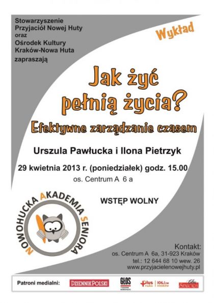 Podczas wykładu będzie można usłyszeć o zagadnieniach organizowania czasu w życiu codziennym oraz metodach służących osiąganiu założonych celów. Seniorzy poznają też wskazówki dotyczące tego w jaki sposób zarządzać swoimi obowiązkami, by znaleźć czas na relaks i zainteresowania.