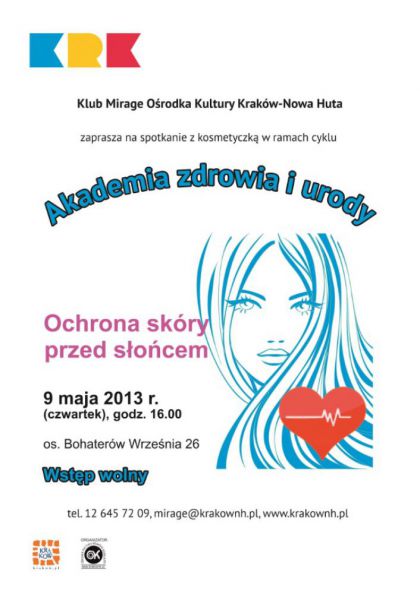 Zapraszamy panie do Klubu Mirage Ośrodka Kultury Kraków-Nowa Huta (os. Bohaterów Września 26) na kolejne spotkanie z konsultantkami kosmetycznymi z cyklu Akademia Zdrowia i Urody, które odbędzie się 9 maja br. o godz. 16.00