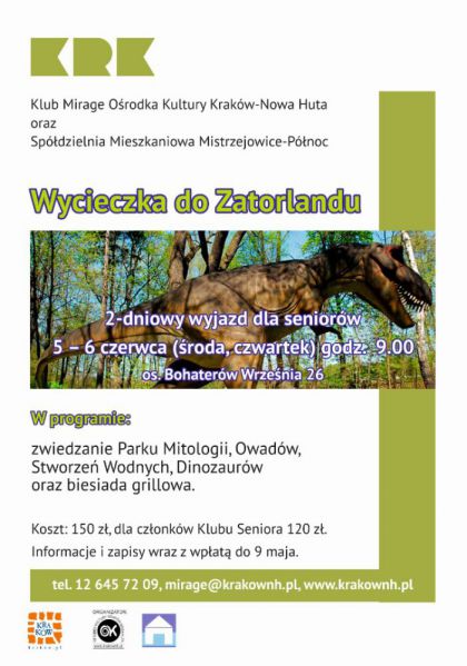 W dniach 5-6 czerwca br. Klub Mirage Ośrodka Kultury Kraków-Nowa Huta (os. Bohaterów Września 26) oraz Spółdzielnia Mieszkaniowa Mistrzejowice –„Północ” zapraszają seniorów na 2-dniową wycieczkę do Zatorlandu w Zatorze.