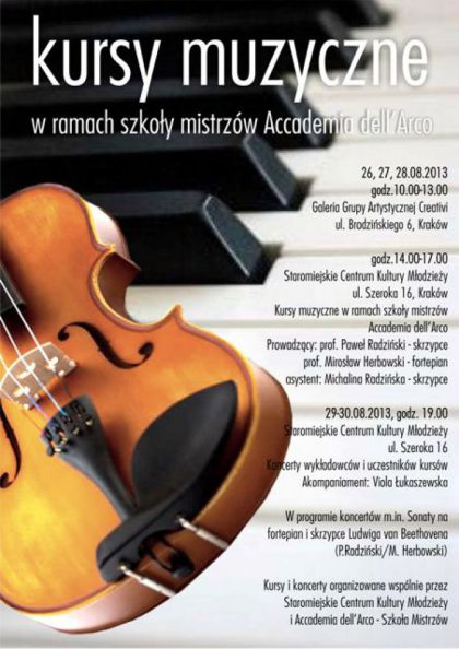 Staromiejskie Centrum Kultury Młodzieży oraz Accademia dell’Arco w ramach swojej Szkoły Mistrzów zaprasza od 26.08 – 28.08.2013 na kursy muzyczne. Zajęcie prowadzone przez prof. Pawła Radzińskiego (skrzypce) oraz prof. Mirosława Herbowskiego (fortepian) odbywać się będą w Galerii grupy artystycznej Creativa przy ul. Brodzińskiego 6