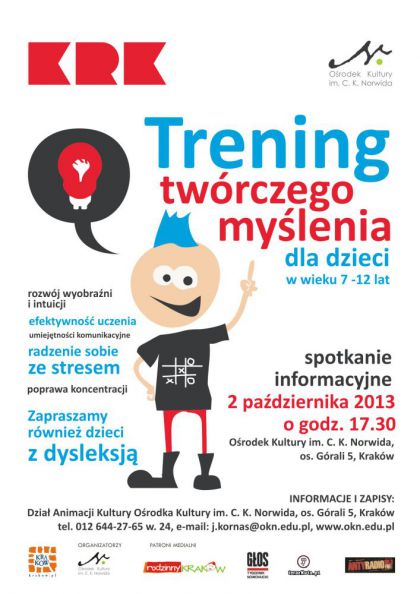 Zapraszamy do Ośrodka Kultury im. C. K. Norwida dzieci w wieku 7 -12 lat na zajęcia rozwijające wyobraźnię i intuicję, poprawiające efektywność uczenia, rozwijające umiejętności komunikacyjne, pomagające w radzeniu sobie ze stresem oraz poprawiające koncentrację.
