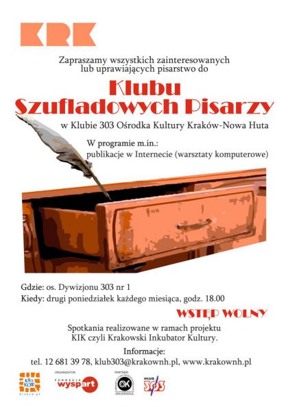 Kolejne spotkanie w Klubie 303 Ośrodka Kultury Kraków-Nowa Huta (os. Dywizjonu 303 nr 1) zakładające wspólne czytanie utworów, doskonalenie się w sztukach edycyjnych przy użyciu komputerów oraz włączanie się w środowisko twórców publikujących w Internecie. Propozycja dla osób w każdym wieku, zainteresowanych lub uprawiających amatorsko pisarstwo.