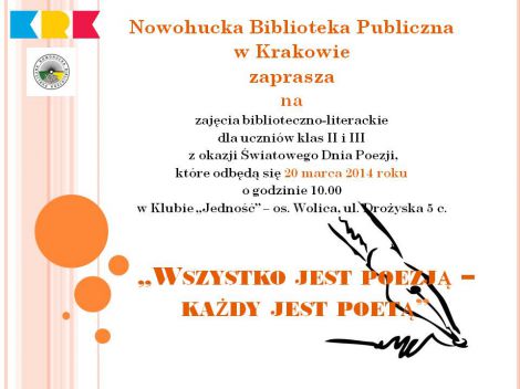 Z tej okazji Nowohucka Biblioteka Publiczna przygotowała specjalną ofertę, której celem jest promocja czytania i tworzenia poezji.