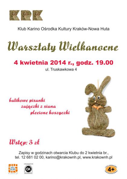 Klub Karino Ośrodka Kultury Kraków-Nowa Huta (ul. Truskawkowa 4) zaprasza dorosłych na świąteczne warsztaty rękodzieła, które odbędą się 4 kwietnia o godz. 19.00. Podczas zajęć będzie można poznać techniki wykonania batikowych pisanek, zajączków z siana oraz plecionych koszyczków.