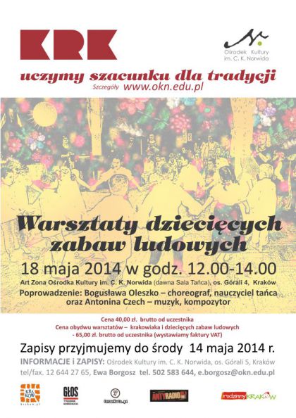 Ośrodek Kultury im. C.K. Norwida zaprasza do Art. Zony (dawniej Sali Tańca – os. Górali 4, Kraków) na Warsztaty prostych, dziecięcych zabaw ludowych, które poprowadzą Bogusława Oleszko – choreograf i nauczyciel tańca oraz Antonina Czech – muzyk i kompozytor. Głównym, choć nie jedynym, celem organizacji warsztatów jest przygotowanie nauczycieli przedszkolnych do udziału ich grup w IV Małopolskim Przeglądzie Dziecięcych Zabaw Ludowych – „O zielonego smoka”, organizowanym w październiku 2012 r. przez Ośrodek Kultury Norwida. Zapraszamy również osoby chcące poznać dziecięce zabawy ludowe , by przekazać tę wiedzę dzieciom.